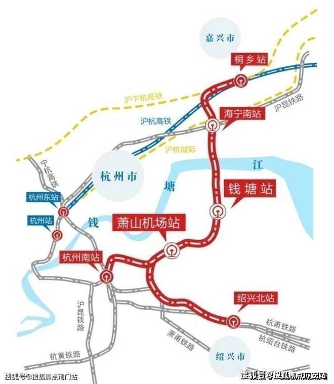 高铁钱塘站:2021年10月,铁路杭州萧山机场站枢纽及接线工程(简称“杭州机场高铁”)先行工程初步设计获省发改委批复,项目全长约85km,纵贯串联起浙北与浙中,全线新设钱塘站、萧山机场站、海宁观潮站,改扩建桐乡站,投资总额约382亿元。钱塘站位于钱塘区新湾街道河景路和义蓬东二路交叉口的钱塘站。它是机场高铁始发站,有5座站台和11条铁路轨道线,未来还预留接入规划中的市域铁路水乡旅游线。