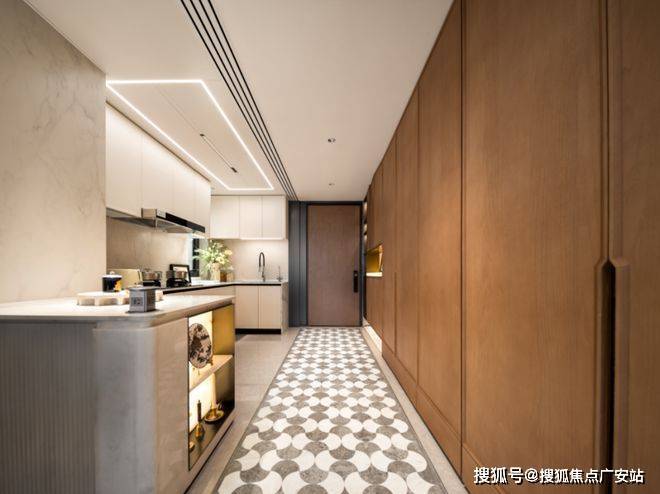 玄关位置地面采用石材,个性化的logo拼花,尊崇感十足,配合定制玄关柜,柜内交付有除臭精灵,功能性与颜值,双双拉满。