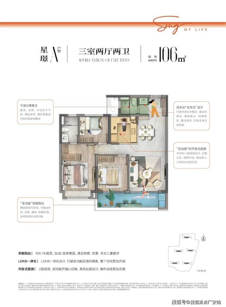 约106㎡户型点评:双联阳台约6.7米面宽,加设L型俯景面,满足晾晒、赏景、采光三重需求,LDKB一体化设计,打破各功能区域的隔离,整个空间更加开阔,开放式厨房 U型厨房,封闭敞开随心切换,高效台面设计,操作动线更加合理!