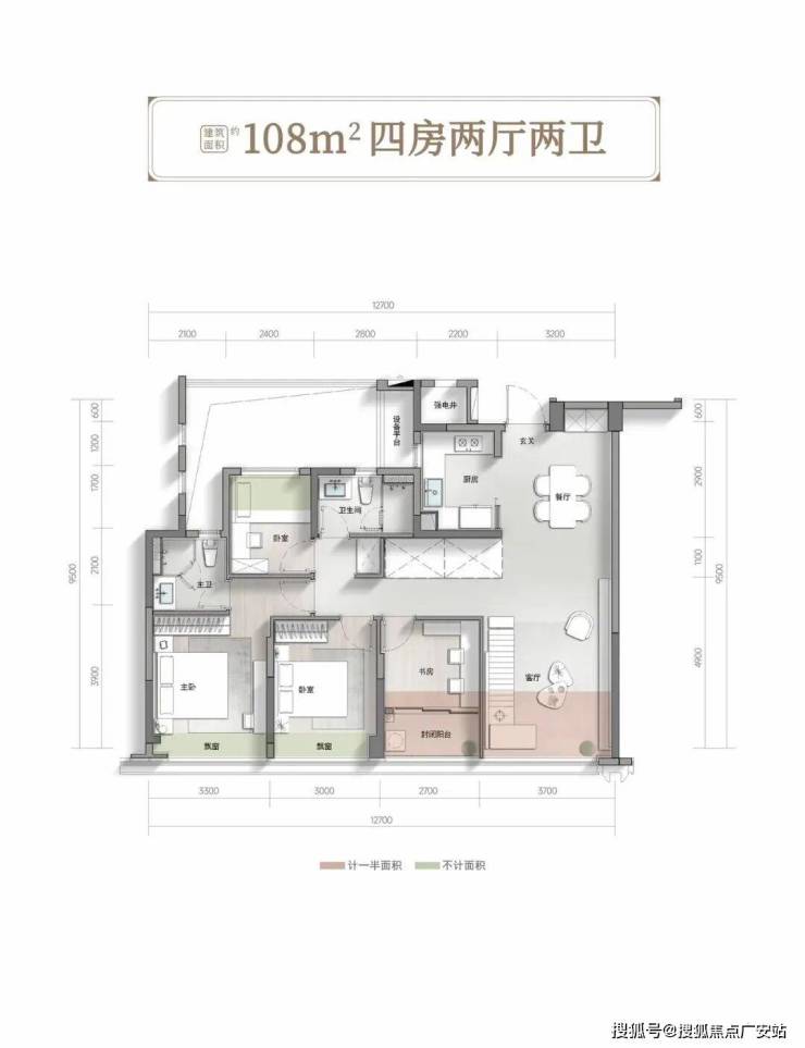 建面约108㎡四房两厅两卫户型