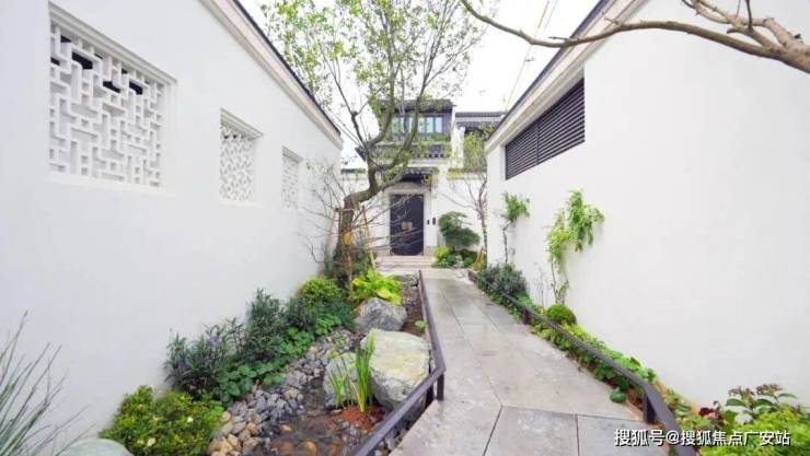 进入项目,归家动线两侧,白墙黛瓦、小桥流水、曲径通幽、芭蕉疏影相间,以两排为一组,围合成二十四条巷道,还原经典的江南坊巷。