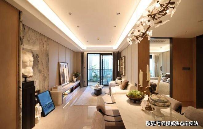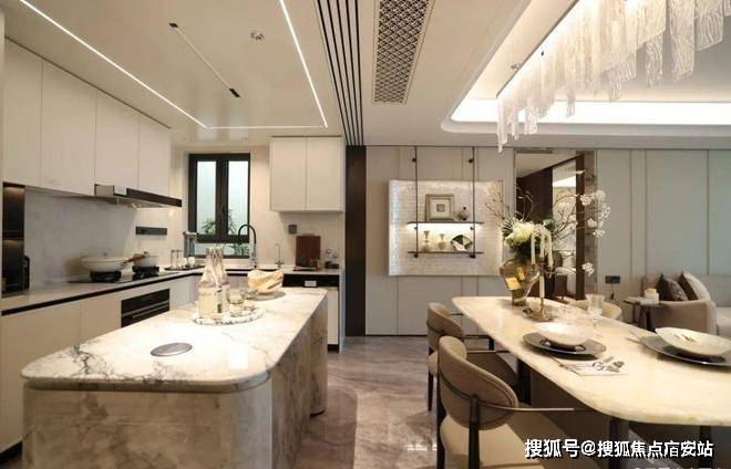 再来看看134㎡3室2厅2卫样板房。比起112㎡户型,这个客厅要宽敞很多,岛台也可以做成独立样式,摆放6人长桌也绰绰有余。主卧采用270度拐角飘窗设计,采光面拉满。