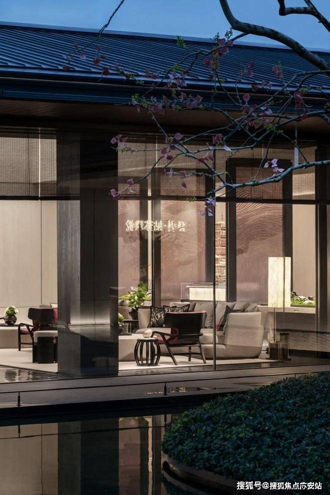保利姑苏瑧悦取法苏州园林的廊桥框景线条美学,演绎为框体线条造型和简洁舒展的立面肌理。在地取材,运用质朴拙雅的御窑金砖,提取粉墙黛瓦的江南之色,定制兼具东方韵味和现代质感的蟒水纹。