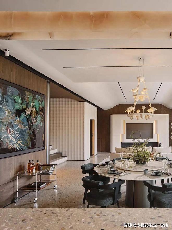 下叠空间则以另一种语言诠释着生活的温度——在这里,庭院与室内的边界被温柔消弭,高定沙发正静静等待归人,大理石餐桌上凝固着月光般的雕花。这些器物会记住生日蛋糕的甜,也包容深夜归来的苦——整装交付的不仅是家具,更是未来生活的全部脚本。