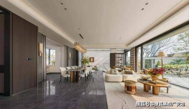 以274㎡的排屋户型为例,一层设置客厅、餐厅、厨房与长辈房,客厅采用“横厅”设计,搭配大面积的落地玻璃窗,将室外园林景观引入室内;