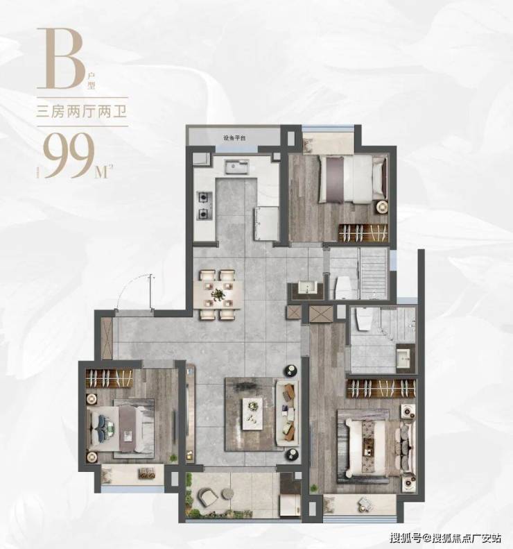 考虑95-99㎡三房主力户型,性价比最高,适合三口之家或四口之家居住