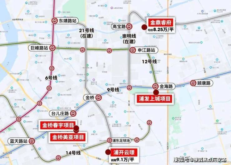 浦发上城地处金桥板块边缘,与曹路板块接壤,但价格参考上则应参照金桥的价格梯度。与浦发上城相差12号线1站路(申江路站)距离的金鼎阅府于今年3月入市,均价7.95万/㎡,两者单价相差约1W;沿14号线2站路(浦东足球场站)的浦开云璟均价8.95万/㎡,单价相差约2W。