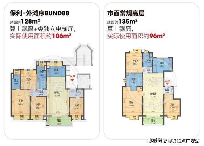 BUND88户型实际使用面积非常出彩,对比常规同面积高层户型,实用率要高近10%