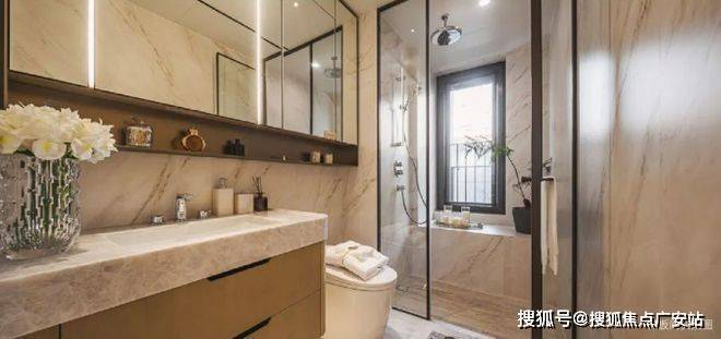 另外,淋浴间做移门隔断;墙面做壁龛工艺(用古铜金属材质),方便收纳洗漱用品;镜柜设置可活动层板,预留抽纸口、插座,镜面也做了补光,同时为爱美妆的主人预留了收纳口红、刷子、饰品等的格子,处处高定细节。