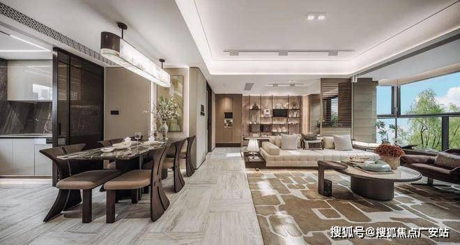 客餐厅选用进口欧亚木纹天然大理石,并进行拼花处理,独特的纹理和质感提升了室内空间的品质与艺术性。