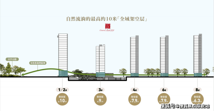 同时,不同于大多数豪宅中规中矩的做法,它以"全域架空"的魄力,将整个社区生活平面抬高设计约6.3-10米的架空层,使得住宅犹如被托举起来,漂浮在公园之上。