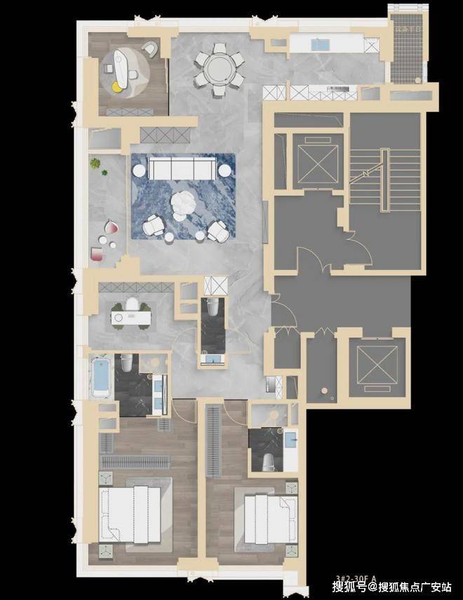 项目中心坐落的中央景观规模约3000㎡,周边环绕着四座建筑,其中三幢为超高层设计,整体布局高低兼顾,启承有序,开阖有度,塑造城市云端生活新方式。