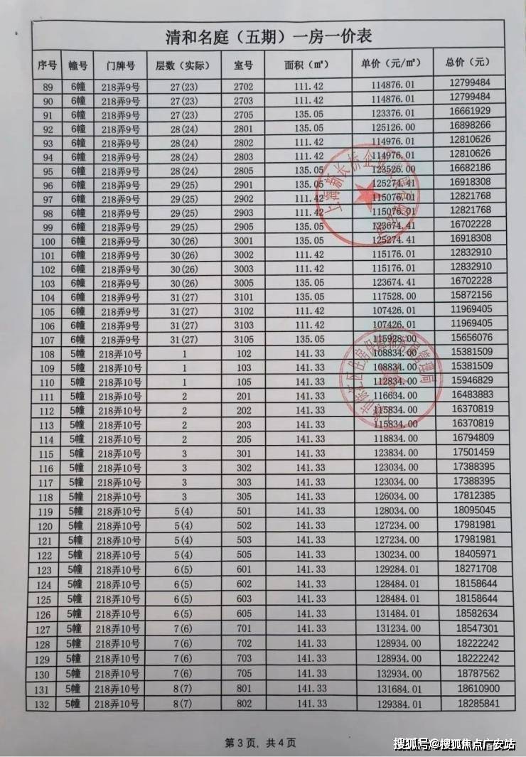 前期一房一价表公示 :