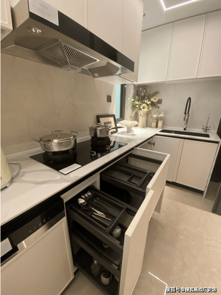 德国厨房顶奢品牌博世(或同等档次)四件套抽烟机+燃气灶+洗碗机,带末端净水器,弗兰卡(或同等档次)大单槽+可抽拉龙头,冰箱也是交付的!柜门白色烤漆面板,抽屉分区也都是帮大家细致划分,如多功能调味拉篮+谷物抽+碗碟拉篮等。岛台上配置可升降插座,铝合金抽屉,石材背景板的金属开放格实用性很强。电视背景墙采用卡慕白的石材+皮革造型,弧形吊顶,相当讲究,连空调出风口的形状都打造为海上·清和玺logo山茶花的形状~~