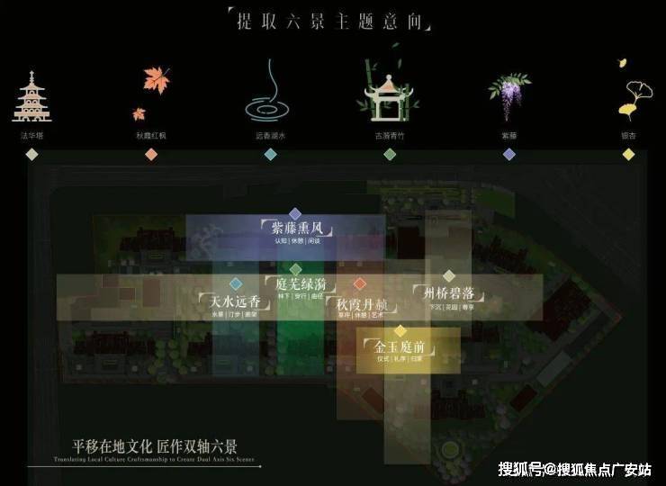 建筑们围合出的中心花园中,州桥老街、秋霞圃、远香湖、古猗园、紫藤园、银杏古树等嘉定6景被南山地产提炼、转译,形成了具有在地文化特色的6大景观主题空间。