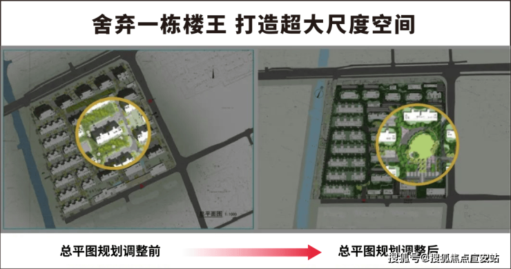 答案还是“高诚意”,在原本方案中,社区中央有一栋楼,但中国铁建为了营造更具仪式感、更大尺度的中央景观,宁愿舍弃这栋楼王,放弃利润调整规划。