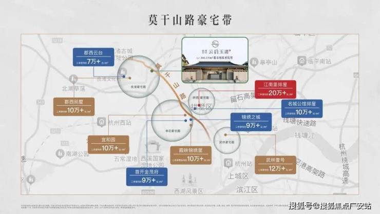 首先是位置,云启玉渚位于杭州最主要的莫干山路豪宅带,所谓「一条莫干山路,半部杭州豪宅史」,串联起了良渚-申花-桥西-武林四大豪宅圈,囊括了江南里、宜和园、武林壹号等杭州顶级豪宅。