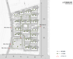 人车分流,机动车在靠近出入口的坡道进入地下车库,步行居民通过组团间的景观道路入户。