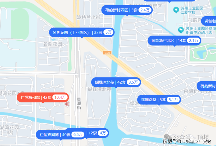 👉独墅湖:星岛仁恒,二手在售均价约7.4w/㎡,周边同业态二手房价格不过才5w/㎡;
