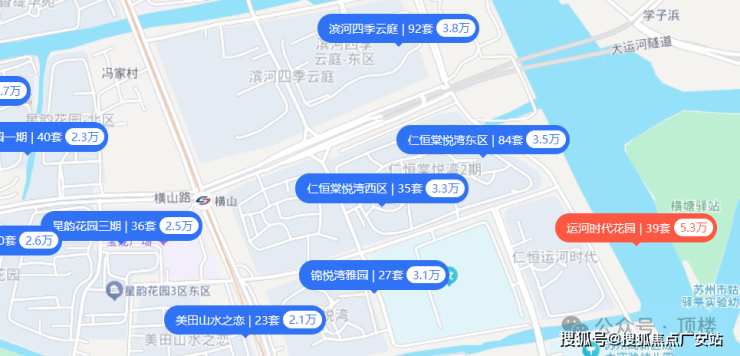 👉狮山:仁恒运河时代,整体挂牌均价约5.3w,周边的二手房均价基本在2.5-4w/㎡,价差立显。