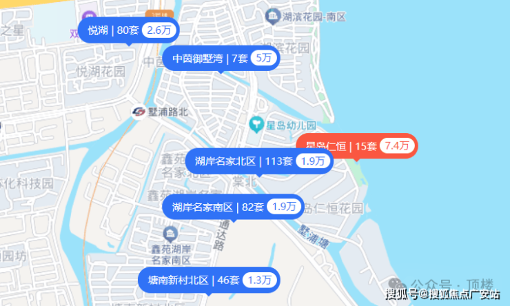 👉双湖:仁恒双湖湾挂牌约6.5w/㎡,海和院二手最高成交10w/㎡;