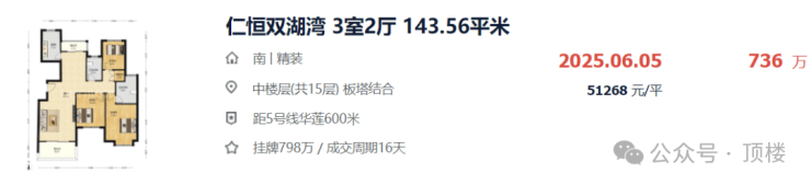 其中双湖湾约143㎡四房小高层户型,在当前二手房市场整体成交周期拉长的背景下,依然能卖出5.1万/㎡的高单价!
