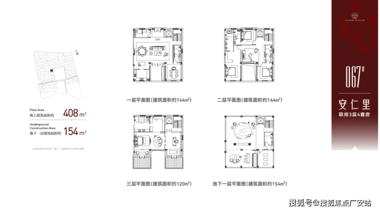 地上建筑面积约408㎡户型,地下一层建筑面积约154㎡。