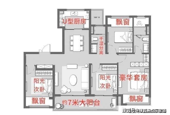 每个房间均带阳台或飘窗,赠送面积大的同时增加收纳空间;U型厨房,干湿分离卫生间等设计最大程度满足业主的居住舒适度。