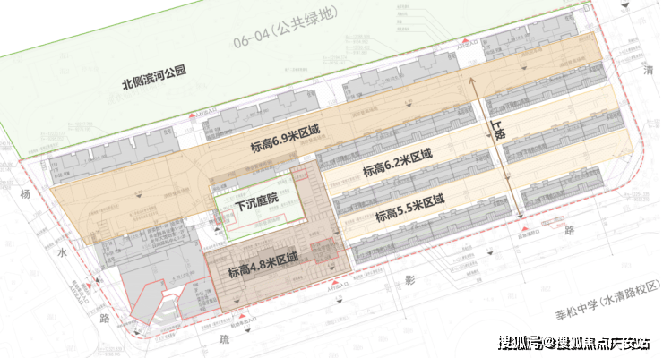 从公示的总图上来看,地块南侧场地标高在4.8米,北侧已经到了6.9米,有2.1米的高差.