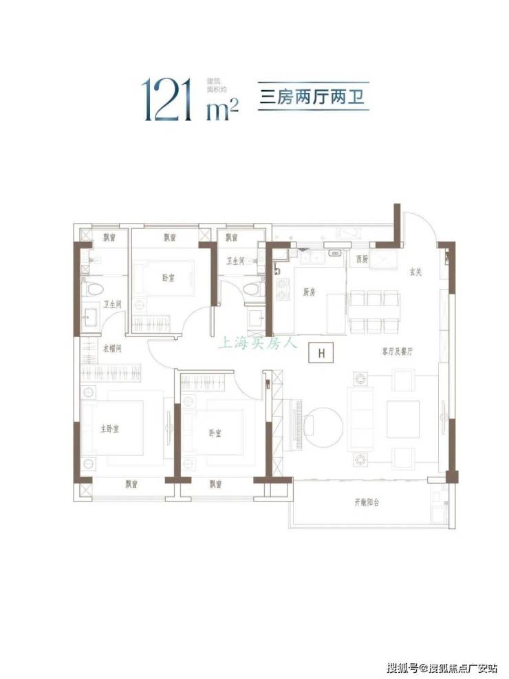 户型总结:3开间朝南,全屋阳光充足;L型厨房转角移门设计,最大化空间视野;四飘窗设计,通透空间享受;动静分区,亲密有度;套房式主卧,容纳私谧生活点滴;
