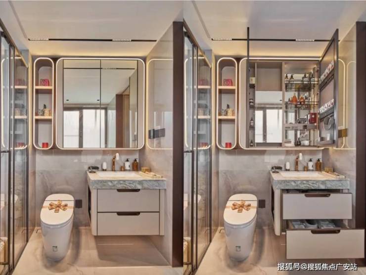 保利天奕特别关注到女性的生活需求,专门在卫生间配备了科勒美颜龙头、美妆镜柜、美妆冰箱,采用“顶+面双补光照明”,能把“女本位”需求做到如此细致,目前没有几个项目能做到!