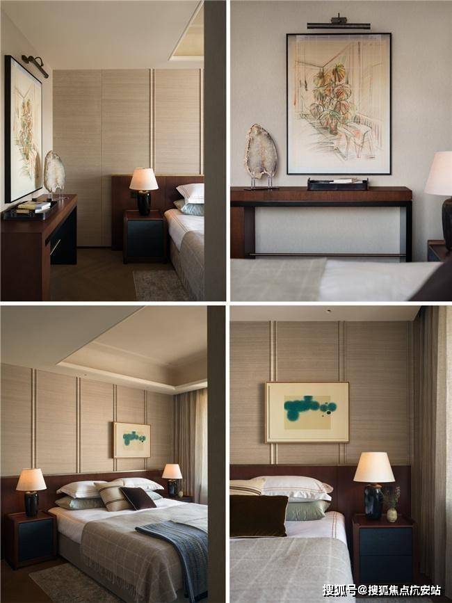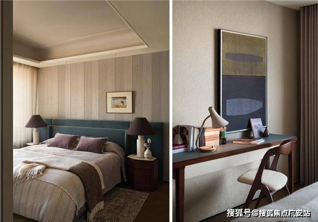 主卧延续整体设计语言,空间氛围转向沉静与内省,塑造优雅而深刻的生活范式。艺术版画赋予空间戏剧张力,暖灰调皮质床靠、珍珠鱼皮床头柜、来自丹麦的羊绒织物与手工锤打的黄铜灯具并置,让经典被解构、转译,自然地融入当下的感官体验。