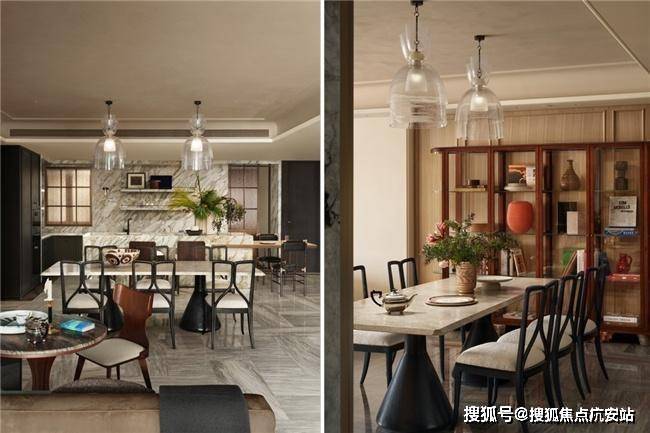 两盏玻璃吊灯悬于餐桌上方,延续着经典设计的简洁线条。桌面选用奢石材质,其自然纹理被纳入法式线条的构图逻辑之中,在低饱和度空间背景下,呈现出沉稳的视觉质感。