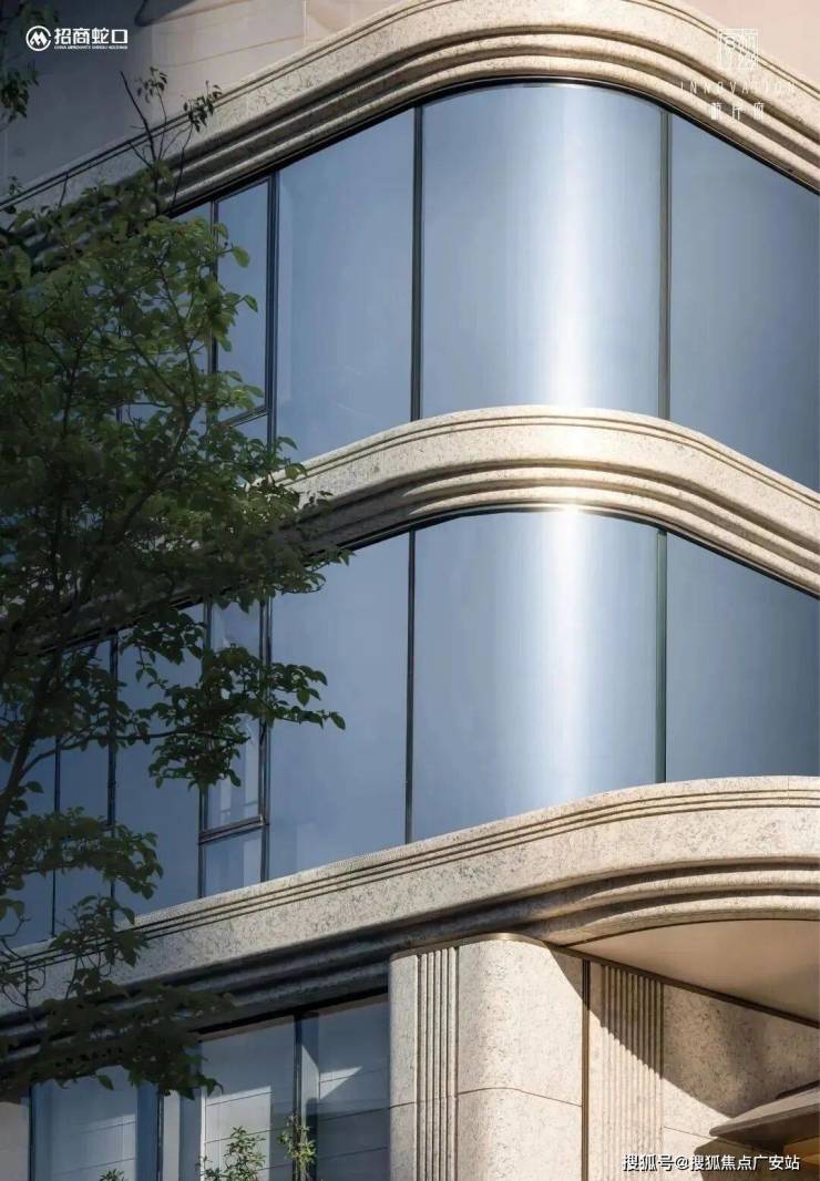 南北两侧立面均是超高的窗墙比,并配以大面落地玻璃。层间线条则是铝材和石材的点缀结合,使用了大量的曲面弧形石材。用的还是跟合肥招商玺同款的「双曲倒弧工艺」,成本非常高。