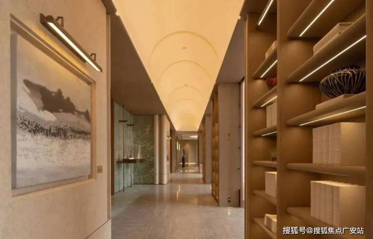 参考台北嘉佩乐酒店的叙事风格呈现第二重门厅。以一座环形的前场庭院作为业主归家的情绪整理空间,打造从繁华到宁静的空间过渡,开启度假般归家体验。