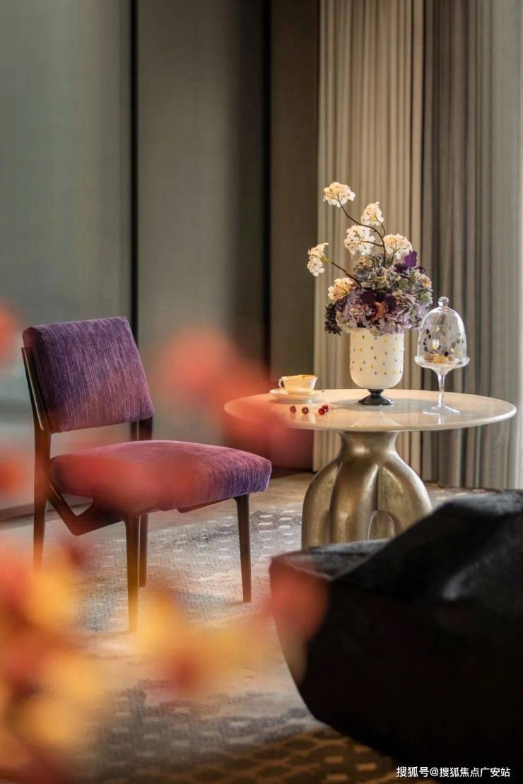 茶几与边几高低错落,两把紫色单椅如音符跃动其间,丝绒、大理石、藤编等不同材质在空间中完美融合。于此,对望窗外苍翠绿意,品一杯红酒,伴着优雅的轻音乐,艺术与酒杯触发一场诗意的对话。