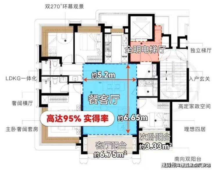 约5.2米开间、约6.65米的进深的客厅,再加上高达95%的实得率,每一组数据都在印证“老钱”的这份从容尺度。