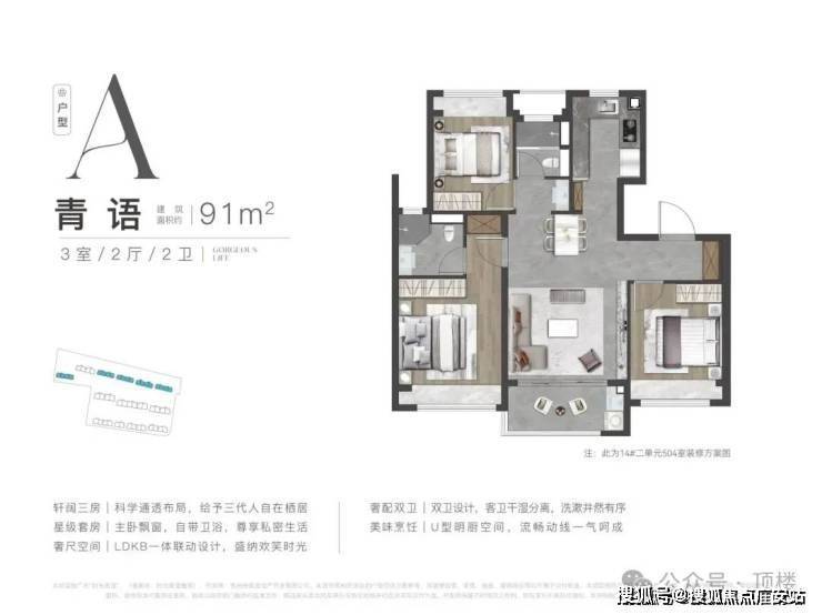 👉91㎡三房两卫:三开间朝南,全屋3飘窗+开敞阳台,主卧套房设计,得房率78.5%,总价285万起;