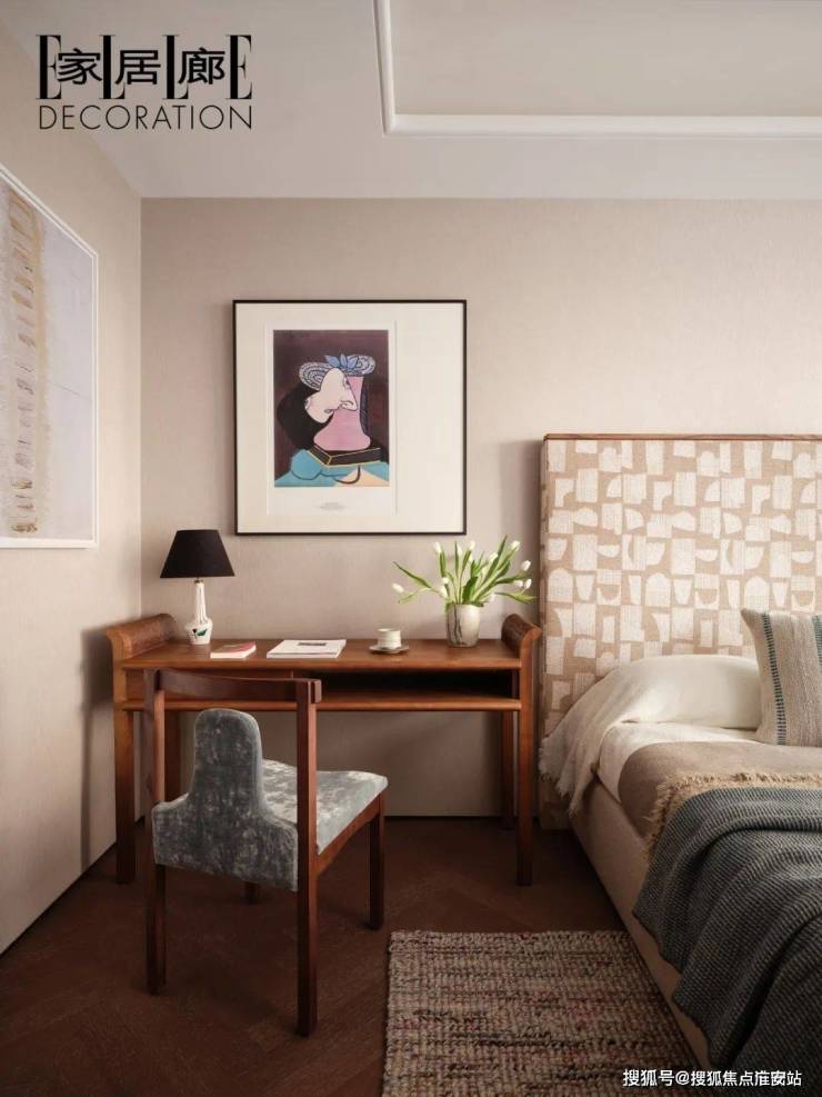 休闲室尺度相对较小,斜角的梳妆台镜面设计拓宽了视野的局限,空间中的挂画,同样也以视觉体验作为考量进行搭配。当伴侣在一侧饮茶、阅读,感受晨光时,自己则在对角的书(梳)妆台整理晨容,化妆镜的存在,也带动了家人之间微妙的互动。