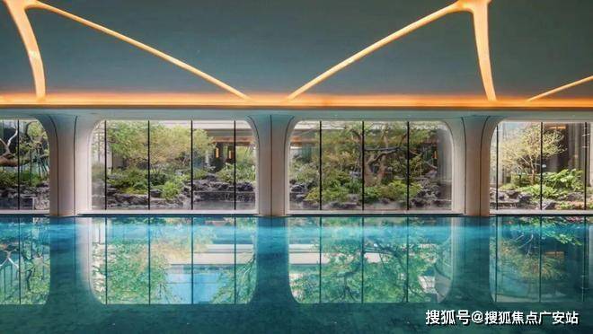 艺术馆般室内无边际泳池,在内部空间设计上,微微拱起的穹顶像云朵漂浮在上空,两侧的柱子成花瓣般的典雅造型,向上延伸,形成独特的记忆点。中央庭院一侧的落地幕墙玻璃,实现自然景观的室内延伸感。泳道尽端的景泰蓝背景墙,更是加强了空间的奢华氛围。