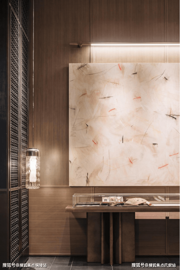 例如,在归家的动线上,保利以古代“提灯夜游”为灵感,将“灯”这一意向穿插其中——在公区入户大堂内,造型别致的壁灯格外惹眼,其灵感来自于“中国古典豆形灯”;落壁灯则是以古铜不锈钢搭配仿透光云石灯具,营造出朦胧的光晕氛围,颇具东方意蕴。