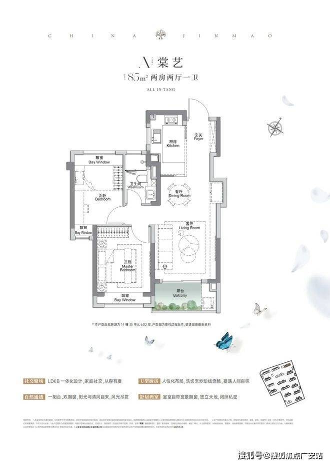建面约85㎡两房:竖厅设计+独立玄关+双开间朝南,次卧飘窗拓展空间,适配年轻夫妻首置;