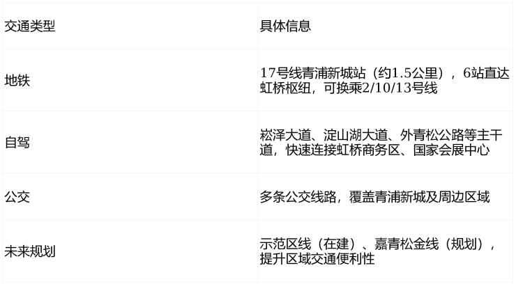 🚶地铁步行距离:距17号线青浦新城站约1.5公里,步行需15-20分钟,公共交通便利性一般