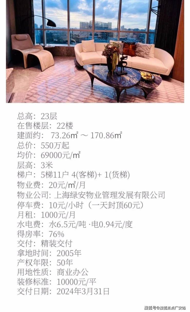 物业类型为50年商办,建筑面积73-170平方米,总价550-1300万,交房标准为带装修(软装+中央空调),总层高23层,挑高3.3米,梯户比5梯11户,得房率76%-90%,户型方正实用,全景落地窗设计。