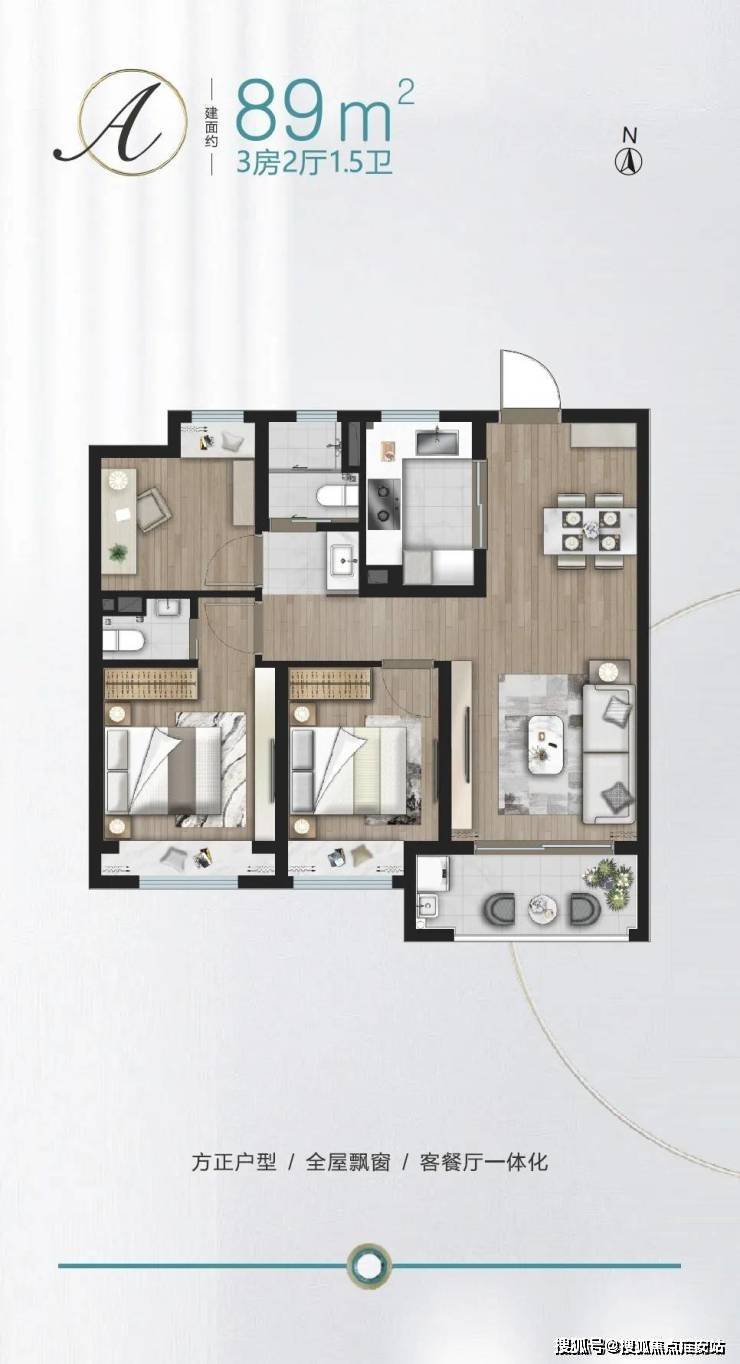 建面约89㎡做3房,功能性上就占尽先机,没想到项目还有1.5卫配置,主卧升级套房,真正实现一步到位!