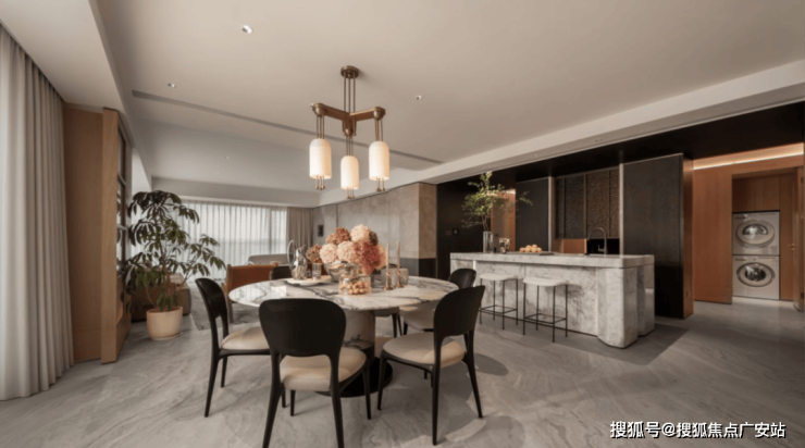 建面约240㎡四房三厅三卫,由国际知名室内设计师吴滨执笔, 以 厨电、收纳、家政、智能、幕墙、定制 “ 六大满配 ” , 实现了从空间功能、材质美学到身心体验的全维革新 :