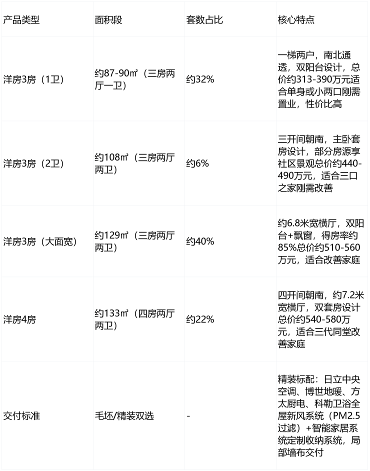 主力户型:建面约87-133㎡,得房率高达82-85%,一梯两户设计,提供毛坯/精装双选项(一期1/3/5号楼为毛坯,其余均为精装)