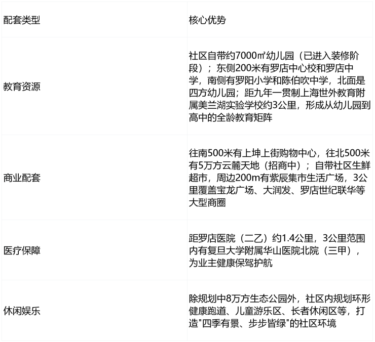 成熟底蕴:位于罗店老镇核心区,周边20年成熟居住氛围,商业、教育、医疗等配套已完全兑现,无需等待规划落地