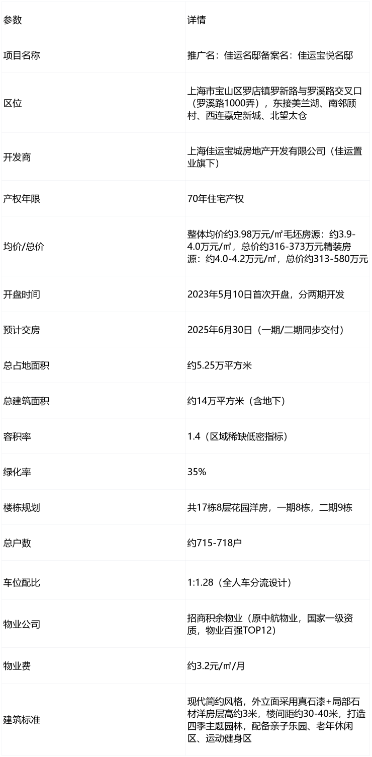 核心定位:佳运置业打造的宝山罗店纯低密洋房社区,容积率仅1.4,规划17栋8层花园洋房,主推约87-133㎡三至四房,均价约3.98万元/㎡,总价约298-580万元,适配刚需至改善家庭,预计2025年6月底交付。