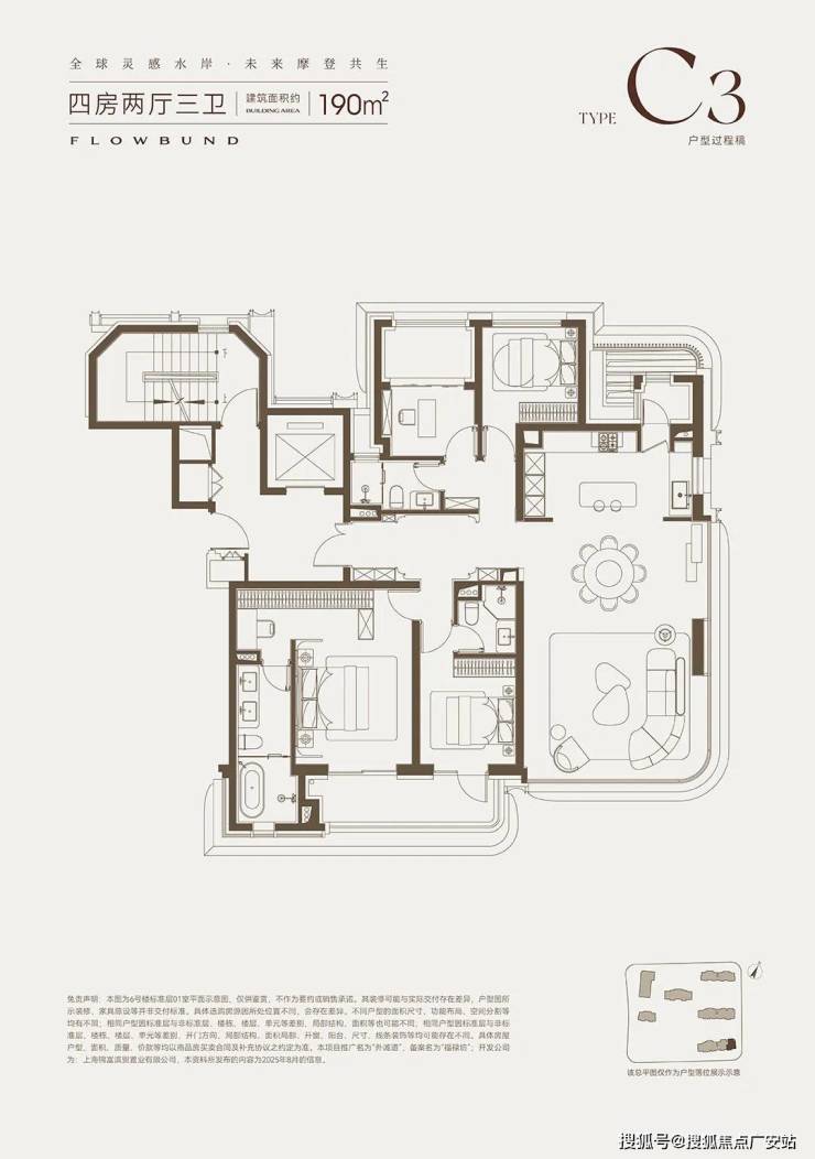 改善家庭的理想之选约190㎡四居,东边套主打270° 全景视野,客餐厅采用弧形玻璃幕墙环绕,东侧可远眺黄浦江景,北侧可俯瞰社区下沉式庭院,景观视野堪称极致;